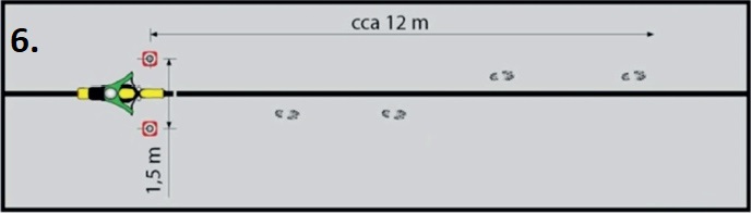 2) Provedení jízdy při nízké rychlosti – následování zkušebního komisaře rychlostí chůze cca 4 km.h-1 v přímém směru (délka dráhy cca 12 m)
